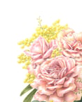 The wattle, given its flouncing trails of sweet fluffy buds, was intertwined with the more substantial roses in a way which highlights its presence in the painting, throughout each area. Finding ways to place the young unopened buds all the way through to the heavier explosions of flowers was painstaking and deliberate.
