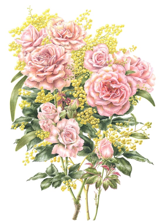 His Excellency approached Heidi in early 2022 to commission a painting of Australian and British flora to represent the relationship between the two nations, as a gift to Her Majesty for the Jubilee. He asked that Australia's official floral emblem, Acacia pycnanth Benth., or the Golden wattle, be painted alongside representative UK flora (ultimately, the rose was selected).
